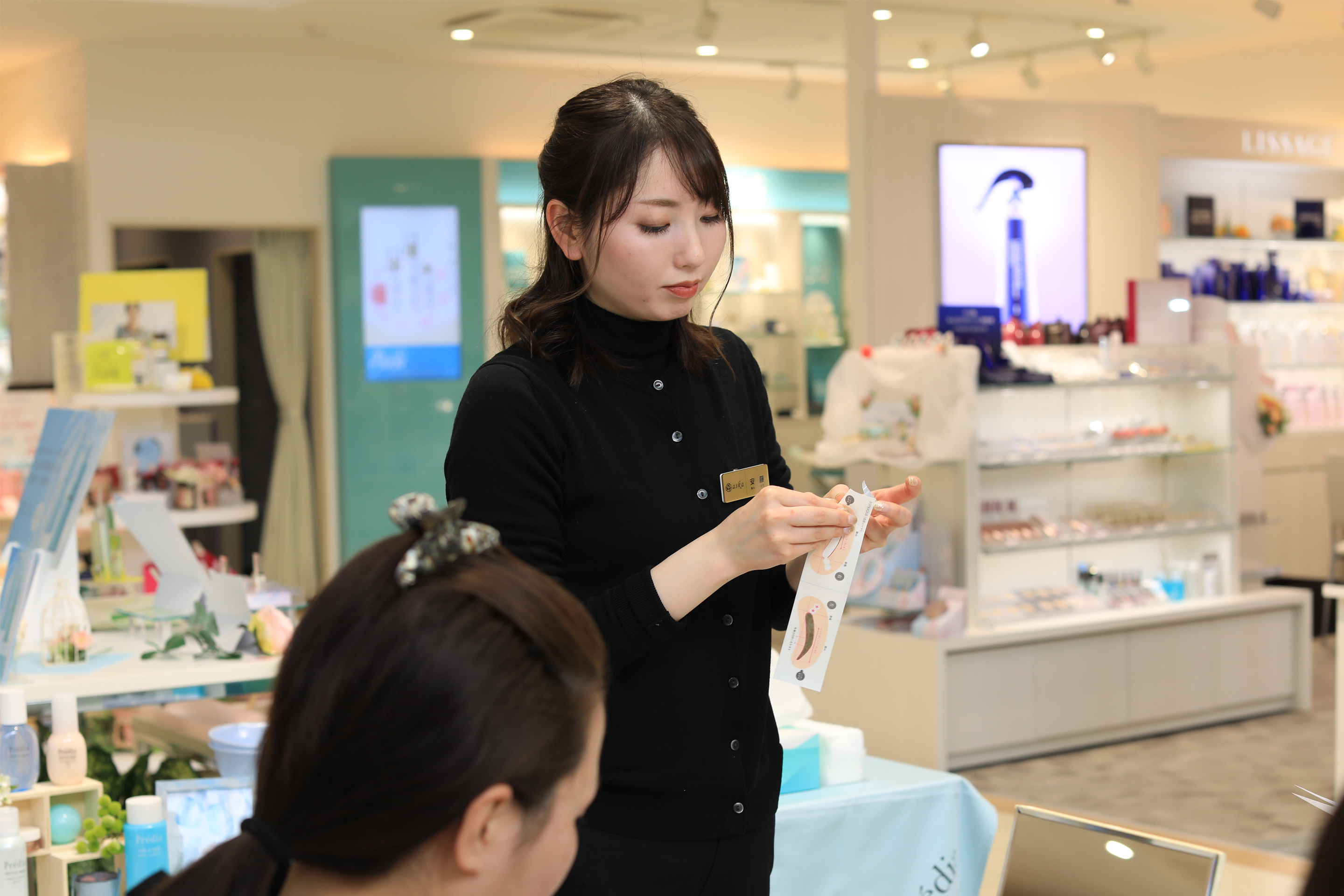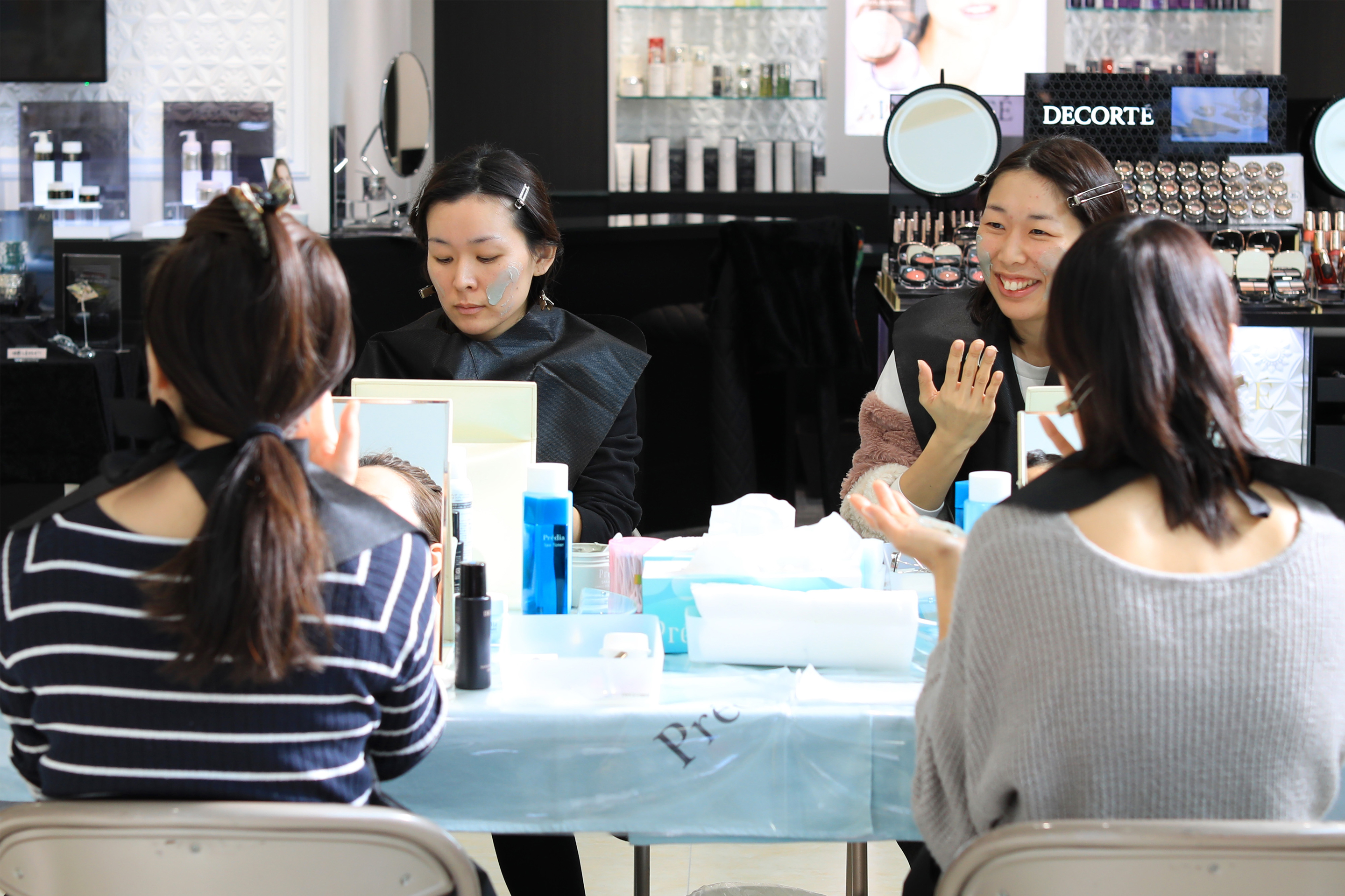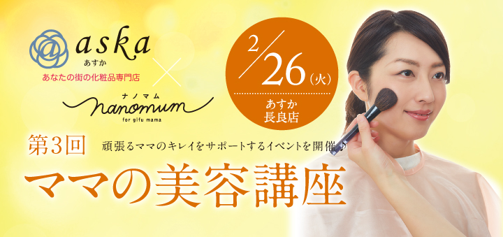 【イベントレポート】あすか×ナノマム「第2回ママの美容講座」 by ナノマム編集部 2,661 views この記事は2019年2月6日に更新されたもので、内容が古い可能性がありますのでご注意ください。 ママを応援する化粧品専門店「あすか」と「ナノマム」がコラボした、頑張るママのキレイをサポートするイベントが開催されました。 第2回目は「あすか県庁前店」にて、「あすか」スタッフのアドバイスによる、スキンケアを中心にした美容講座が行われました。顔に透明感が出たところでメイクアップのアドバイスもあり、毎日のお手入れが楽しみになる講座となりました。 目次 スキンケアの基本、メイク落としについてアドバイス 1日の終わりに肌を休ませるために、メイク、汗、汚れをきちんと落とすことがポイント。分かってはいるけれど、自己流だったり、忙しさにとらわれたりして、汚れが残っているままのこともあります。そこで、コットンの上手な使い方やふき取りの方法などを、今日の講師、安藤さんから教えてもらいました。 最初はポイントメイク落としから 右目、左目、口の3カ所を、それぞれコットンを1枚ずつ使いながらメイクを落とします。クレンジングの適量やゴシゴシこすらなくてもきちんと落とせるようなコットンの動かし方を教えてもらい、みなさん、丁寧にメイクを落としていました。鏡を見ながら落とすことも大切です! 顔全体のメイク、汚れを落とし、肌をリセットします。 ポイントメイクを落としたら、次は顔全体のファンデーションや肌の汚れ、皮脂などを落とします。今回は天然ミネラル泥が配合されたクレンジング料を使用しました。表面だけでなく、毛穴の汚れも落とせるように、やさしくのびるクレンジグ料がオススメとのこと。メイク落としが終わると、すでに透明感が!首と比べながら、みなさん納得していました。 肌の状態に合わせてスキンケア いよいよスキンケアで肌の状態を整えていきます。ベタつきが気になる肌、乾燥しやすい肌など、肌の状態に合わせてケア用品を選択すると、よりベストな状態の肌を保つことができます。 薬用化粧水はパックを使って保湿 せっかくの薬用化粧水をしっかり肌に浸透させるために、ローションマスクに染み込ませてパックをしました。肌が柔らかくなり、化粧水の成分が浸透しやすくなります。時間はかかりますがひと手間かけるだけで、潤いやハリのある肌へと導いてくれるそうです。忙しい毎日だからこそ、化粧水パックは欠かせないスキンケアの一つになるでしょう。 パックの時間を利用して、スキンケア商品をお試し 他にもたくさんのスキンケア用品がある「あすか」。いろいろなタイプのスキンケア用品を紹介、体験しました。お得な体験ができるのも、化粧品店内が会場の美容講座ならでは。気になる商品がたくさんあり、参加者のみなさんは熱心に聞いていました。 乳液をつける時もポイントがあります パック終了後、別タイプの化粧水、乳液を使いました。やはり、しっかり浸透させるために、ハンドプレスをするのがポイント。乳液を使うときは、マッサージするように肌になじませ、首すじも忘れずに。 メイク前のひと手間でメイクを1日キープ 講座のスタート時よりも参加者のみなさんの肌に、透明感が出てきました。しっかりメイクを落とすこと、化粧水や乳液をしっかり浸透させることで、美しい肌をキープできることが分かりました。 メイクにとりかかる前にもうひと手間!メイク崩れを防ぐために、収れん化粧水で毛穴をひきしめ、美活クリームでベースを整えました。安藤さんからポイントとなるアドバイスがどんどん飛び出してきました。 理想の肌に近づけるファンデーション使いとポイント時短メイクに挑戦! スキンケアにたっぷり時間をとることができたので、メイクは時短に挑戦。とはいっても相手に自分の印象を与えるファンデーションはきちんと使いたいもの。そこで、安藤さんが教えてくれたのはきれいにやさしくファンデーションが使えるスポンジの持ち方やファンデーションの取り方など。基本をしっかり押さえておくこと。自己流だった方も改めて知ることで、忙しい朝も自信のもてるメイクにすることができます。 そして、簡単、きれいにできるアイメイク、チークなどのポイントメイクの方法も教えていただきました。 何と、美眉シールなるものが登場! 眉毛の作り方は、毎日、悩んでいる人も多いのではないでしょうか。そこで、安藤さんが紹介してくれたのは、美しい眉が描ける「美眉シール」。抜き型シールになっており、自分が持っているリキッドペンやペンシルで美しい眉に仕上げることができます。みなさんもこの美眉シールを試してみました。確かに!きれいで自然な眉に整えることができました。 最後、口紅を塗って、メイクの完成です。 一からスキンケアのアドバイスを受けたことで、知らなかったこと、今まで試したことがない方法などを知ることがで
