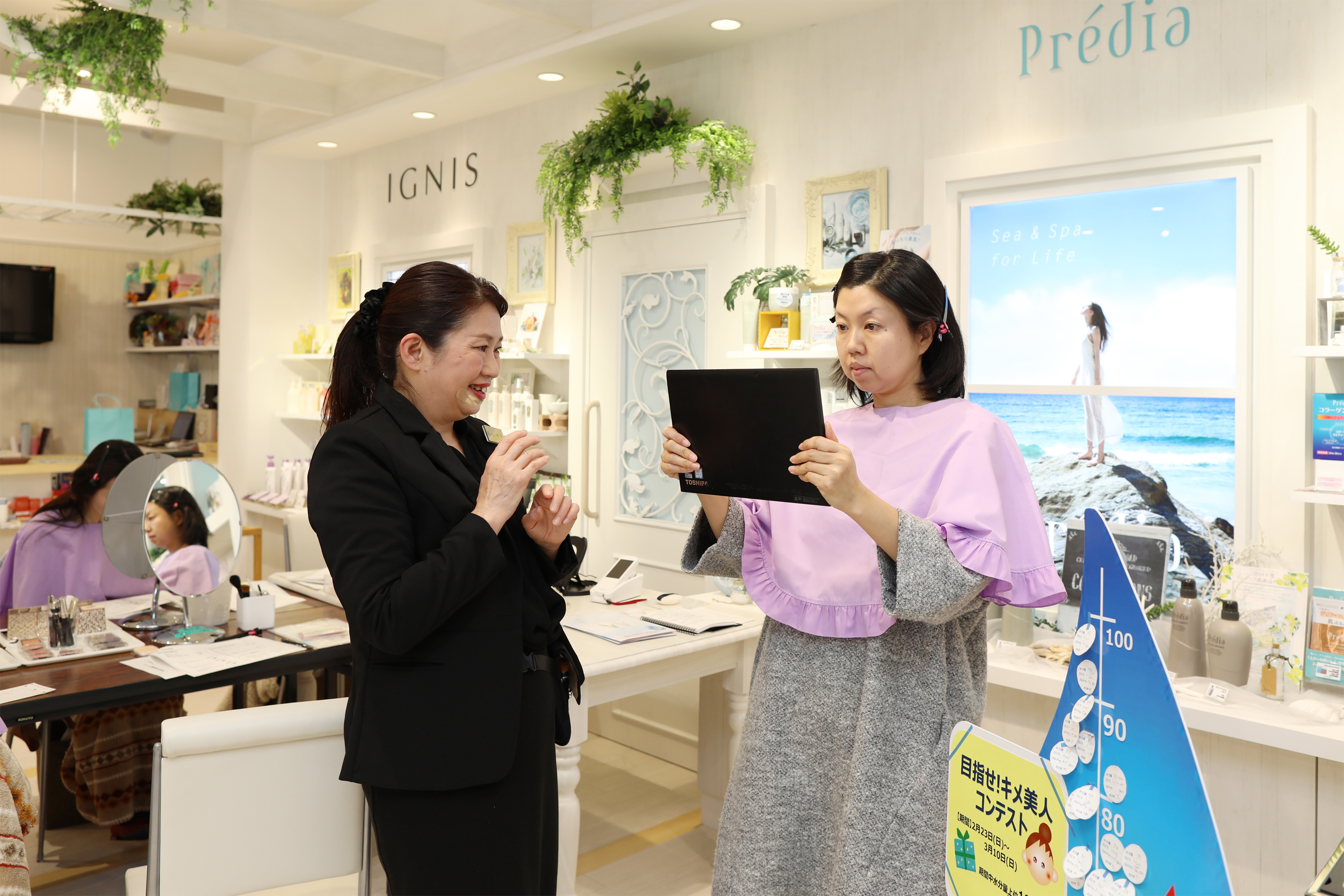【イベントレポート】あすか×ナノマム「第3回ママの美容講座」 by ナノマム編集部 2,853 views この記事は2019年3月12日に更新されたもので、内容が古い可能性がありますのでご注意ください。 ママを応援する化粧品専門店「あすか」と「ナノマム」がコラボした、頑張るママのキレイをサポートするイベントが開催されました。 第3回目は「あすか長良店」にて、スキンセンサーやカラーシミュレーターといったアイテムを使って、一人ひとりに合わせたケア用品やメイクカラーを選びながら、「あすか」スタッフのアドバイスによる美容講座が行われました。 目次 スキンセンサーでキメや水分量をチェック! 若々しく、美しい肌を保つためには、毎日のスキンケアが大切です。そこで、参加者はメイクを落とし、スキンケアの方法を教わることから始まりました。講師を担当した「あすか長良店」のスタッフ仲野さんは「みなさんに楽しんでもらえたら」と、スキンセンサーを用意。この機器は肌にピッとあてるだけで肌状態をチェックできる優れものです。 目で見て確認しながらパーソナルアドバイス スキンセンサーを肌に当ててから瞬時に、水分量・皮脂量や毛穴の状態の分析結果が出ました。クローズアップした肌が画面に映し出され、また、数値化した水分量や透明度なども表示されます。スタッフは参加者と一緒にきめやしわの状態を確認しながら、一人ひとりにアドバイスをしていました。乾燥した季節であったことから、「思っていた以上に肌が乾燥していた」という声が多くありましたが、測定する場所によっては「べたつきの理由が皮脂量の多さだったことが分かった」という方もいて、自分の肌の状態を客観的に知ることができました。 この結果によって、しっとりタイプなのか、さらさらタイプなのか、使用する化粧水や乳液を選択しました。 選んだケア用品をしっかり肌に浸透させました 選んだケア用品を使い、コットンを使ったスキンケアをします。そこで、仲村さんからコットンの持ち方、指のカーブの作り方、なじませる部分の順番、指の動かし方などを教えてもらいました。顔の丸みに合わせてすみずみまで化粧水や乳液をしっかり行き届かせることで理想の肌に近づけていきます。最後、首も下から上へ向かってなじませるところもポイントです。 ブラシを使い、崩れにくいファンデーションのつけ方を教わりました いよいよメイクにとりかかります。 日焼け止めとなる下地をなじませたあと、ブラシを使ってファンデーションを塗りました。ファンデーションをブラシでポンポンととったあと、スタンプを押すように顔におき、ブラシをスライドさせながら肌になじませていきます。ファンデーションブラシを初めて使う方もいましたが、みなさん、ムラなくきれいに塗ることができ、とても自然な感じの肌になりました。 カラーシミュレーションを使い、メイクのイメージをチェック! 次に登場したのはタブレット。一人ひとりの顔を撮影して、何をしたかというと・・・、アイシャドウやチーク、リップといったポイントメイクの色を選択して、メイクの仕上がりを確認していたのです。色は用意されている数百種類から選ぶこともできますが、「なじみカラー」か「際立ちカラー」のどちらかを選ぶと、シミュレーターが自動でおすすめの色を3色、アドバイスしてくれるので、この中から選択すれば、イメージにぴったりの色を簡単に選ぶことができます。 ポイントメイクの色は購入するときに悩む人も多いと思いますが、たくさんの試し塗りをしなくてもこれなら簡単にイメージすることができます。 選んだ色でメイクを開始 ポイントメイクの色は、多くの方が普段のメイクに近い「なじみカラー」を選択しました。それぞれにあったカラーが用意できるのは、化粧品店内で行う美容講座のメリット。「際立ちカラー」は食事会やコンサートなどのお出かけの時に利用できそうです。 アドバイザーならではのテクニックで、ナチュラルな雰囲気に 眉やアイラインの描き方やアイホールでのチップの使い分け、ビューラーの使い方など、ついつい、自己流になってしまう描き方やメイク道具の使い方を仲村さんがアドバイス。新しく知ったことや再確認することで、自然な仕上がりになりました。 リップブラシも使いました リップもブラシを使用することにしました。しっかりリップをブラシになじませてから塗ると、きれいに上唇の山や口角まで塗ることができたので、みなさん、鏡を見て満足されていたことが印象的でした。いつもとは異なるメイク道具を使ったことで今後、自分に合った方法を選ぶことができ、さらにメイクを美しく仕上げることができそうです。 美容講座だからこその イメージに近いメイクの色を選びながら、仲村さんからのテクニックを加えて、とても素敵な表情になられた参加者のみなさん。自然な笑顔もあり、魅力的な雰囲気になりました。 参加者か
