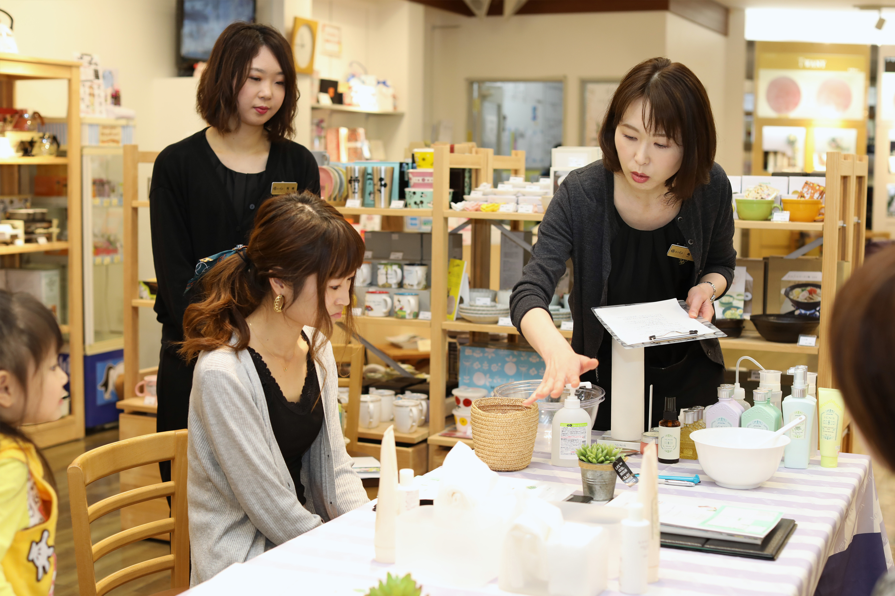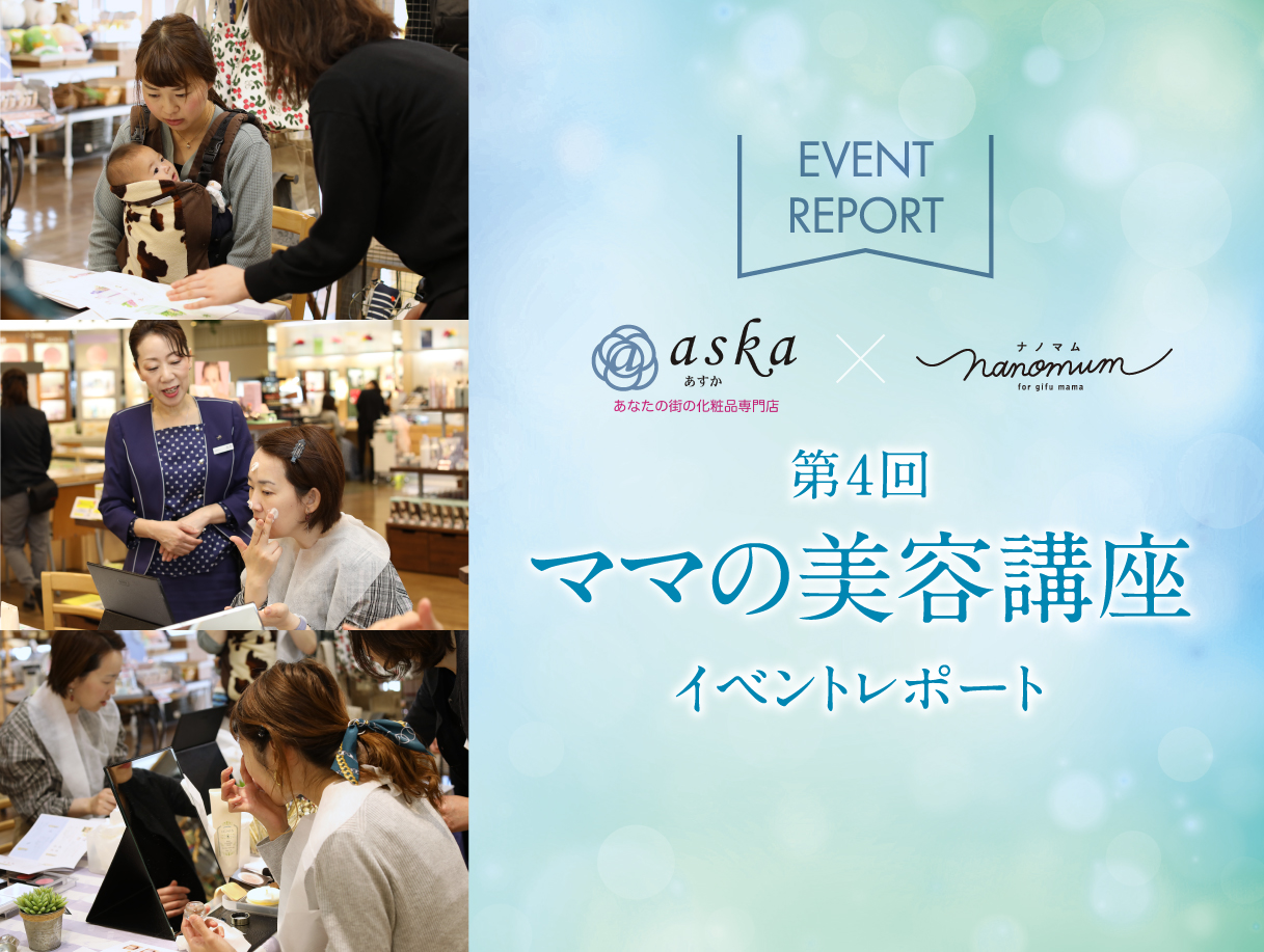 【イベントレポート】あすか×ナノマム「第4回ママの美容講座」 by ナノマム編集部 2,485 views この記事は2019年5月16日に更新されたもので、内容が古い可能性がありますのでご注意ください。 ママを応援する化粧品専門店「あすか」と「ナノマム」がコラボした、頑張るママのキレイをサポートするイベントが開催されました。 「あすか柳津店」での第4回目は、スキンケアがメインに。スキンケアと言っても今回は疲れた肌をリセットするだけではなく、天然の香り効果を合わせた、心からリラックスできる美容講座となりました。 目次 肌チェックで自分の肌状態を確認 講座のスタート前に、参加者はスキンセンサーを使って一人ひとりの肌をチェック。角層、はり、血色感、表皮がチャートになって表示され、一目で判断できるようになっていました。このチャートを基にスタッフが細かくアドバイス。自分の肌状態とアドバイスを確認してから、講座が始まりました。 中からのきれいにも働きかけるスキンケア 初夏は紫外線が多くなって乾燥する時期でもあり、春からの花粉や黄砂の影響で荒れやすくもなっている季節です。さらに、新年度が始まったことによる気持ちの疲れが出てくる頃。そこで、スタッフから「肌を整えるのはもちろん、使う度に喜びも感じられる化粧品を使って欲しい」とのアドバイスがあり、1日の最後に肌も心もリラックスできるような化粧品を使用しながら、参加者はスキンケアの方法を教えてもらいました。 心もリラックスできる化粧品の秘密は「ハーブの自然な香り」。内側からの美しさも手伝ってくれるようです。 先ほどの肌チェックの結果から、乾燥を解消するタイプか、皮脂っぽさを解消するタイプか、自分の悩みに近いスキンケア用品を選び、いよいよ実践に入りました。 クレンジングにティッシュを使ってみましょう まずはクレンジングからです。コットンを使ってポイントメイクを落とした後、クレンジングクリームをたっぷり手にとって、顔全体にクレンジングクリームをなじませました。ここで登場したのが、ティッシュペーパー。三角に折って顔半分に当てて、しっかりと押さえます。クレンジングクリームと一緒にメイク汚れがティッシュに移るので、ゴシゴシこすらず、きれいに落とすことができます。これには参加者のみなさんも驚き。身近なものを使って、気軽にきれいにすることができます。 洗顔ソープの泡を体感。肌触りと香りでリラックス 本来ならここで洗顔をしますが、今回は割愛するため、手の甲に洗顔ソープの泡を乗せて体感してみました。もこもことした泡は密着感があり、シトラスの香りがして爽やかな印象。みなさん、しきりに泡の香りを感じながら心地良い気分に浸っていました。泡を拭き取ってみると手の甲が明るく見え、すっきりとしていました。 たっぷりの化粧水で肌の中まで浸透させました 化粧水にもコットンを使いましたが、「コットンの向こうが透けて見えるくらいたっぷりと染み込ませてください」とスタッフ。たっぷり取った化粧水は肌に浸透させていく感覚で、丁寧に、優しく、しっかり肌に染み込ませていきました。 幸せな気分になる美容液でスイッチオン! 次に登場したのが、キュートなデザインのボトルに入った美容液。オイル層とウォーター層の2層になっており、シェイクして使用することで常にフレッシュな状態で使うことができます。手にとって肌になじませてみると「元気が出てくるみたい」と、すぐにスイッチが切り替わったような感覚に。香りも良く、幸せな気分にさせてくれるような美容液です。直接の使用感が分かるのは、美容講座だからこそ。 いろいろなメイクアイテムでキュートな雰囲気に スキンケアが十分にでき、やわらかな肌になった参加者のみなさん。次はさまざまなアイテムや好きな色を選びながらのメイクに挑戦しました。生チョコのようななめらかさのファンデーション、イメージで選べるニュアンスフェイスパウダーなど、ベースメイクだけでもいろいろ試すことができ、新鮮な気持ちで使用されていました。 ポイントメイクの色を選ぶ時はスタッフから一人ひとりアドバイスを受けながら、ワイワイ、楽しく女子会のような雰囲気に。柔らかい印象のキュートなメイクに仕上がりました。 軽やかな気持ちで講座終了 美容講座の終盤には、スキンケアで使用したアイテムの香りに包まれ、みなさんリラックスした雰囲気になっていました。 スタッフからは 「みなさん、肌にふれる手つきがだんだん柔らかくなってきた」 「顔色が明るくなった」 「内側からきれいになっている感じがある」 などの感想があがりました。 参加者からも 「今まで、クレンジングはふき取りだけだったけど、押さえることでメイクがしっかり取れることを知った」 「今日くらい優しくやらなきゃいけないと実感した」 と、今後のスキンケアにいかせる講座となったようです。 今回、使用したスキ