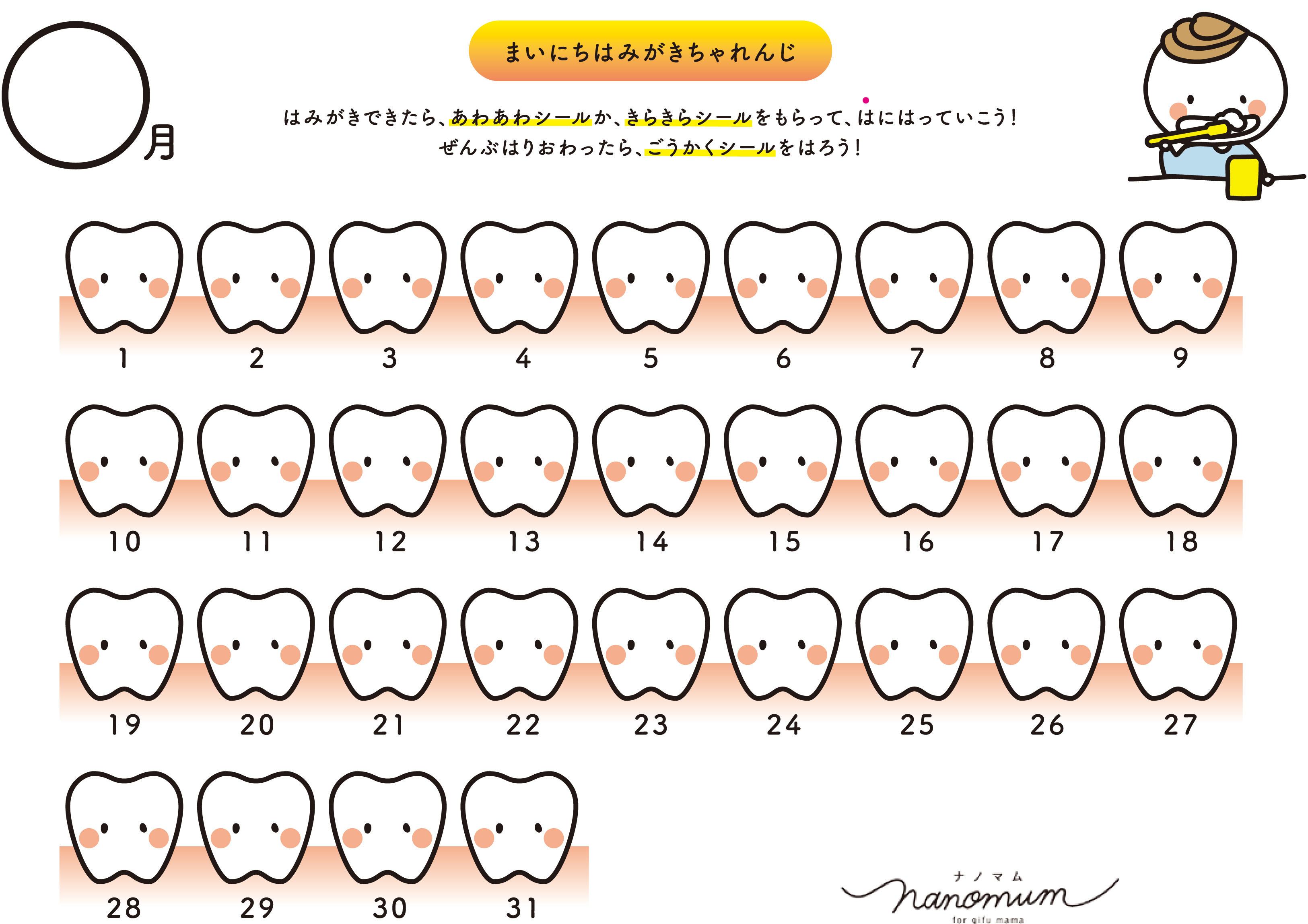 ナノマムの子供と楽しむ手作りキットのコーナーでは、「まいにちはみがきちゃれんじ」シートがダウンロードできます!