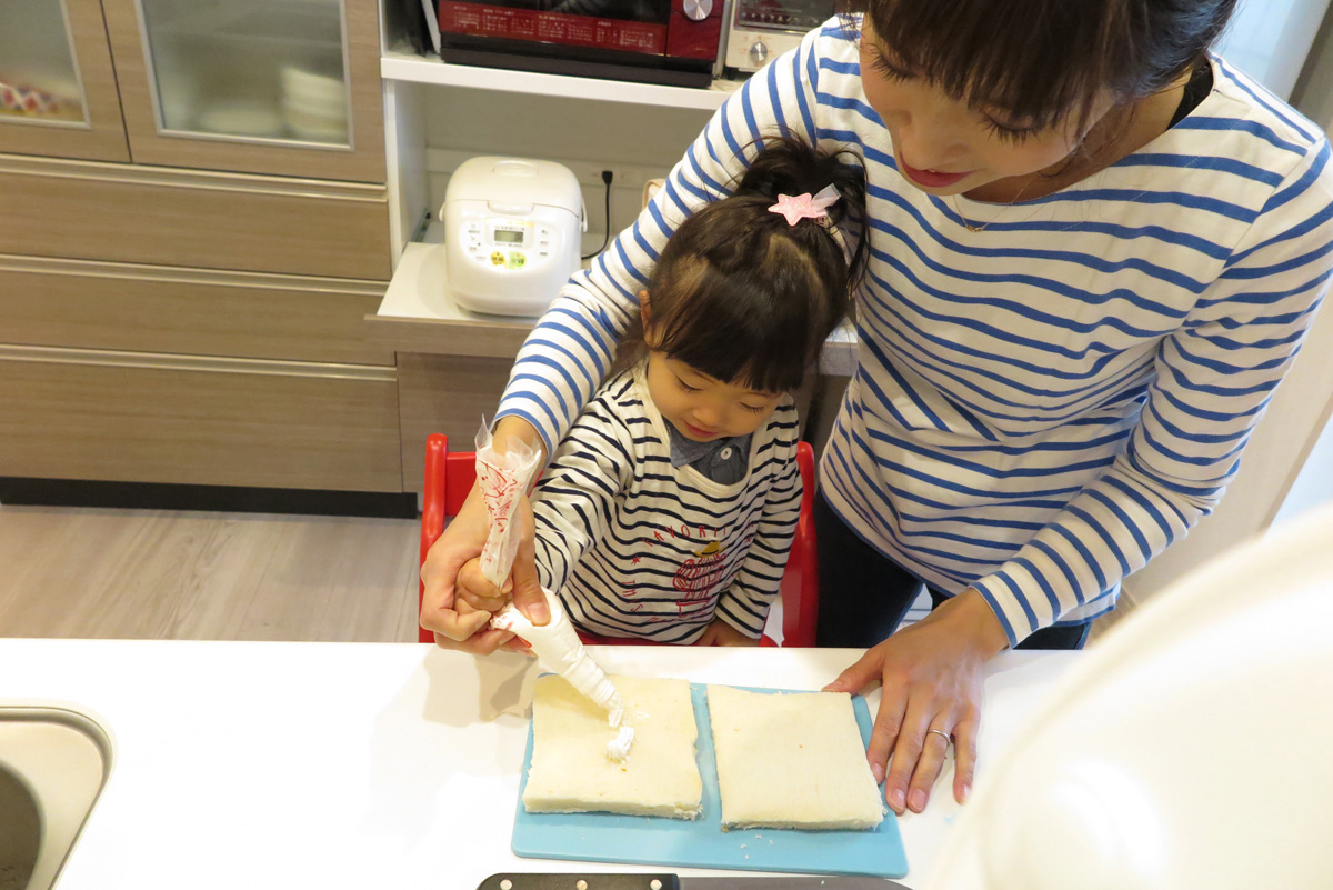 親子クッキングではたくさんの会話も一緒に楽しみたいですね。説明をしたり、状態を言葉で伝えたりすると、子どもの言葉を豊かにしてくれます。