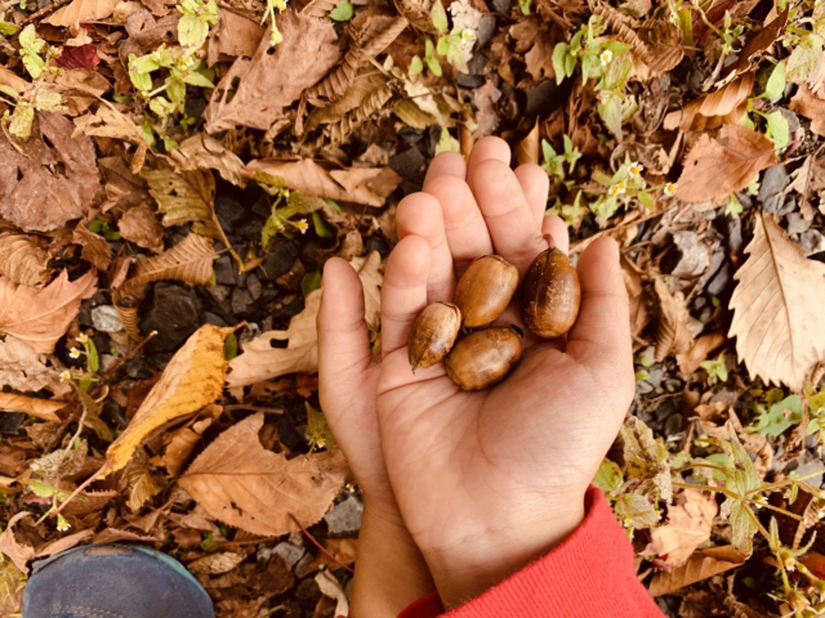 また、集めてきたいろいろな自然のものを、親子でよく観察してみましょう! どんぐりでも帽子があったりなかったり、葉っぱにもいろんな形や色があったり・・・・・・。「この葉っぱは猫の顔の形に似ているね!」「この帽子はどのどんぐりさんの帽子だろう?」など、似ているものや形、色で想像したりして、お子さんといっぱい会話を楽しんでくださいね!