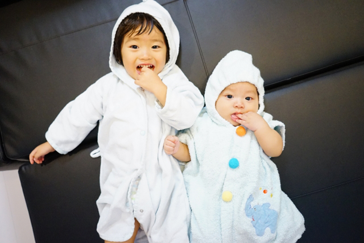 お子さんの皮膚は、大人よりも敏感です。そのため、親子で入浴する場合は、お湯をぬるめにし、入浴する前にお風呂のフタをあけて、浴室を暖かくしておきます。消化不良にならないために、食事の前後30分は、入浴を避けましょう。お子さんの頭や体を洗う時は、自分の体をあらう、半分ぐらいの力で優しく洗うこともポイントです。子どもの皮膚は、大人と比べて約半分の薄さですので、あまりゴシゴシと洗うと皮膚を傷つけ、乾燥の原因にもなります。